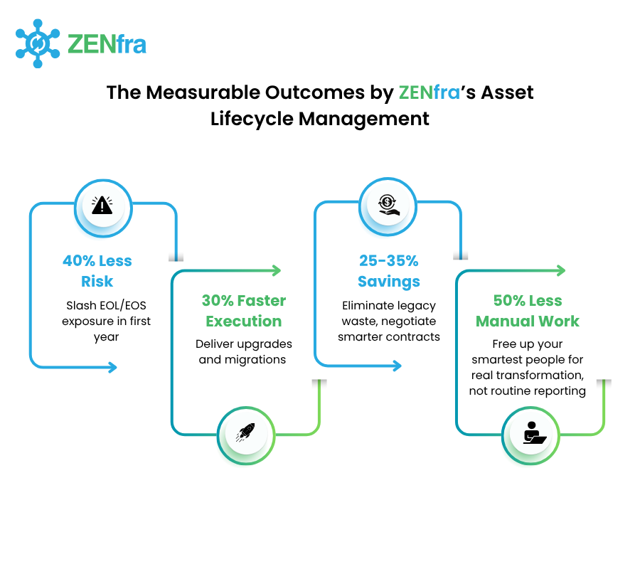Transformation doesn’t wait for IT to catch up-but with ZENfra Asset Lifecycle Management, you never have to choose between operational excellence and business agility. Our platform delivers end-to-end visibility, role-based automation, and real-world expertise so modernization isn’t just a goal – it’s your new standard.